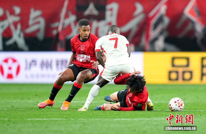 3月15日晚,四川成都,成都蓉城队队员(红衣)与青岛海牛队队员在比赛中。当日,2026赛季中超联赛第2轮比赛中,成都蓉城队主场1比0胜青岛海牛队。中新社记者 安源 摄