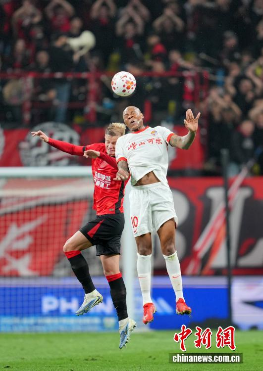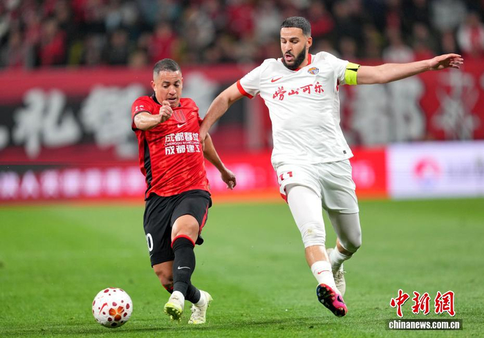 3月15日晚,四川成都,成都蓉城队队员(红衣)与青岛海牛队队员在比赛中。当日,2026赛季中超联赛第2轮比赛中,成都蓉城队主场1比0胜青岛海牛队。中新社记者 安源 摄